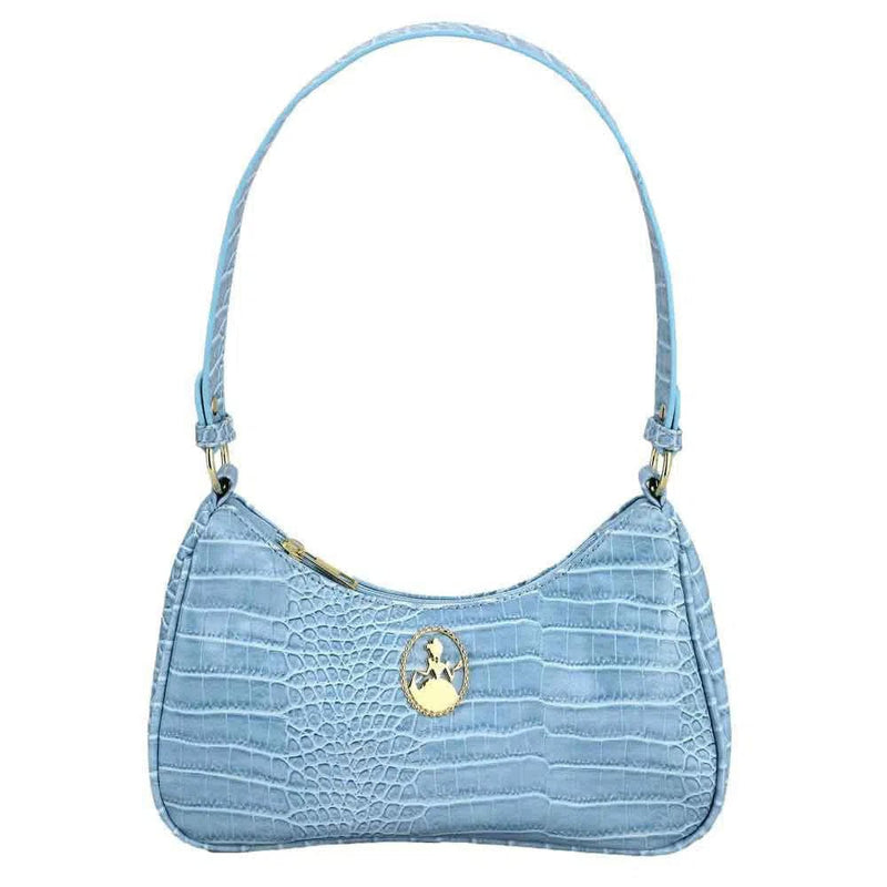 The bag features a chic light blue design adorned with a gleaming Cinderella-inspired metal badge icon, exuding sophistication and charm. Its zipper closure secures your belongings, while an interior zipper pocket provides additional organization for small essentials. Designed to be compact yet spacious, this shoulder bag perfectly balances practicality with timeless elegance.