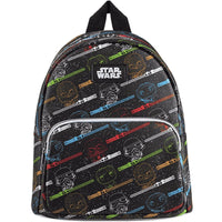 Bring balance to your Star Wars collection with the Loungefly Funko Pop! Lightsaber Mini Backpack! This eye-catching design showcases beloved characters like Leia Organa, Luke Skywalker, Chewbacca, Darth Vader, and Stormtroopers, all reimagined in the adorable Funko Pop! art style. Against a black starry background, vibrant lightsabers in green, blue, brown, red, and white create a stunning display, making this backpack a must-have for any Jedi or Sith enthusiast.