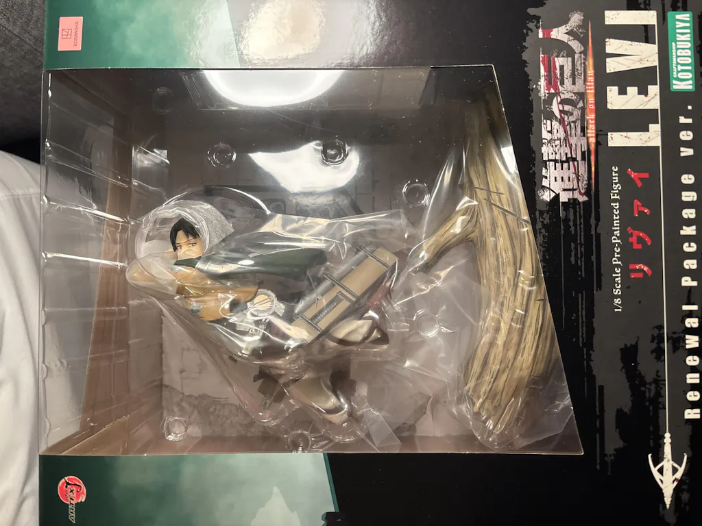 Dynamic Pose: Levi is sculpted in a dynamic pose, capturing him in mid-action as he cuts down a Titan in a forest battle scene.