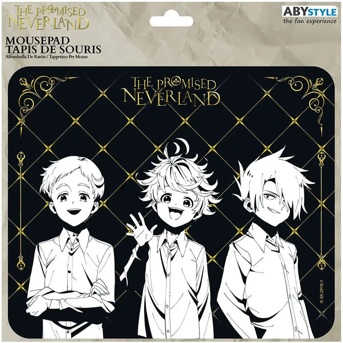Bring the brilliance and determination of your favorite orphans to your desk with the The Promised Neverland - Norman, Emma & Ray Mousepad (9.25"x7.75") by ABYstyle. This elegantly designed mousepad features the iconic trio—Norman, Emma, and Ray—rendered in striking black and white against a sophisticated black and gold patterned background. The design captures the intelligence, courage, and bond of these characters, making it a must-have for fans of the series seeking both style and inspiration at their workspace.