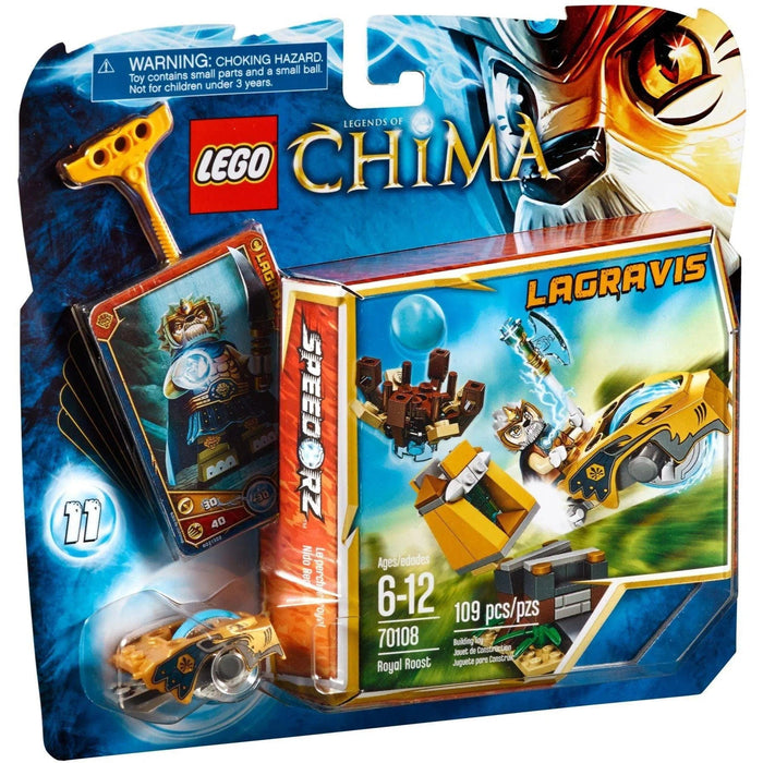 Take on the challenge of the Royal Roost and test your Speedorz accuracy in the Lion tribe's territory! This exciting LEGO set allows you to embark on an epic quest to retrieve the Lion tribe's hidden CHI, perched high on the castle column. Get ready to attach Lagravis onto the lion Speedor, pull the ripcord, and crash into the column, bringing the CHI toppling to the ground. Are you up for the challenge?