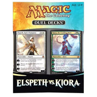 Iconic Planeswalkers: Features Elspeth Tirel and Kiora, each with their unique strengths and abilities, representing a battle between land and sea.