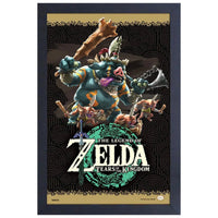 The framed poster comes in a sleek black MDF frame, sized 12.25" x 18.25", and is equipped with two sawtooth hangers for easy installation. This high-quality artwork not only celebrates the compelling narrative of The Legend of Zelda: Tears of the Kingdom but also makes a fantastic gift for any Nintendo Switch enthusiast or Zelda fan. Bring the adventurous spirit of Hyrule to your walls with this standout piece of decor.