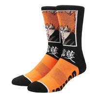 Step into comfort and style with the Bleach - Ichigo Kurosaki Crew Socks. These socks feature a bold design showcasing Ichigo Kurosaki along with iconic Kanji letters, making them a must-have for any Bleach fan. The combination of black and orange colors and the large image of Ichigo adds a fun and unique touch to your wardrobe, while showing off your love for the anime series.