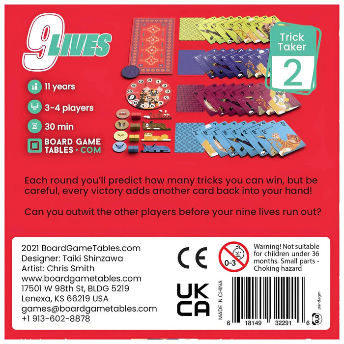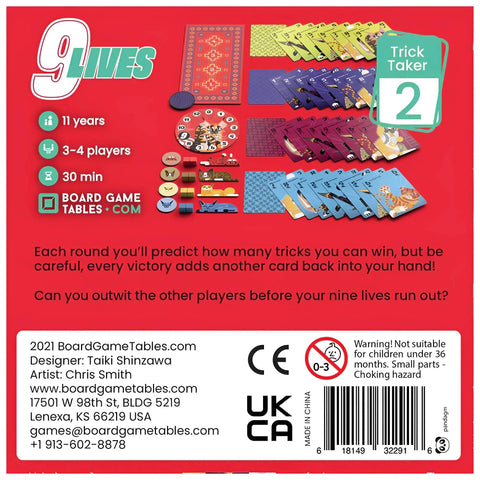 Test your wits and strategy with the 9 Lives Board Game, a thrilling trick-taking game where the myth of cats having nine lives takes center stage! In this unique twist on traditional trick-taking games, you'll bet on how many tricks you can win each round, but there’s a catch: each victory adds another card back into your hand, which can be played again. Can you outsmart your opponents and achieve the ultimate goal of earning nine lives before they do?