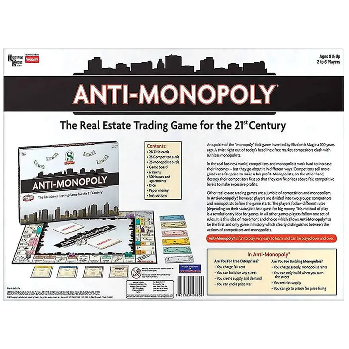 Perfect for game nights, Anti-Monopoly brings new life to a familiar format while sparking conversation about ethics, strategy, and free enterprise. It's designed for 2 to 6 players ages 8 and up, making it a great choice for both kids and adults looking to mix learning with fun. It's more than a game—it’s a battle of ideals, and the outcome is in your hands.