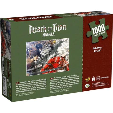 Immerse yourself in the epic world of Attack on Titan with this 1000-piece jigsaw puzzle, featuring breathtaking artwork inspired by the Trost District Battle. This puzzle captures the intensity and drama of the series, making it an ideal challenge for both puzzle lovers and devoted fans of the anime. At a finished size of 27"x19", it provides a satisfying sense of accomplishment once completed.