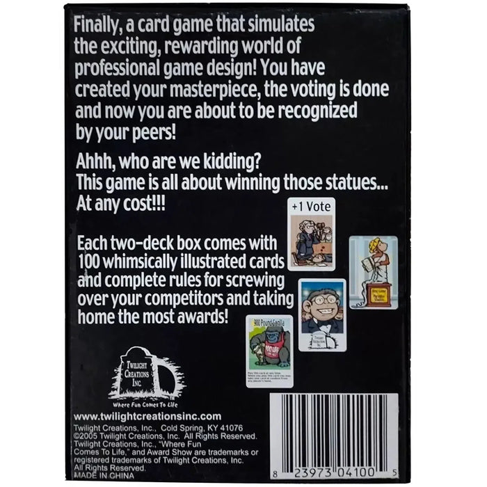 Players are secretly assigned to one of six game companies, then strategically place vote cards—ranging from -1 to 2 votes—on nominated companies. But only one company’s votes will be counted per round, and players must cleverly decide when to reveal, bluff, or manipulate the outcome. The game ends once all six awards have been contested, and the player who has collected the most cards—not necessarily the most awards—emerges victorious.