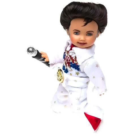 product-benefits Includes Outfit Inspired by Famous Elvis Eras: Doll features detailed mini attire evoking 1950s Jailhouse Rock and 1973 Aloha performances with playful, childlike charm.