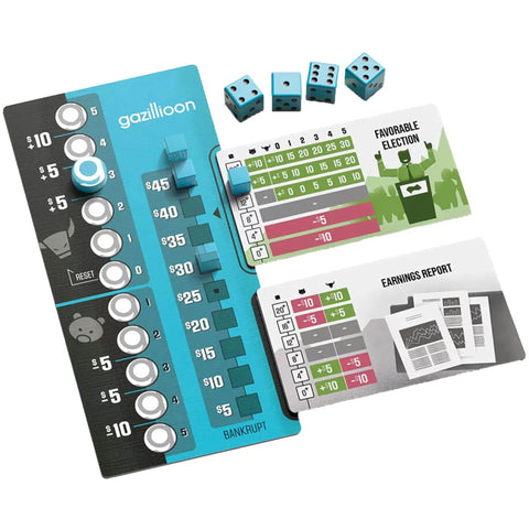 product-benefits Gameplay: Players take turns buying, selling, and shorting stocks while using forecast cards to determine stock price changes based on news headlines.