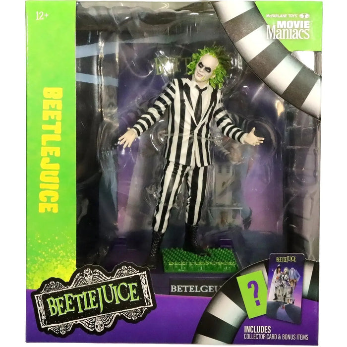 Bring home the mischievous spirit of the afterlife with this Betelgeuse Black & White Striped Suit Figure from McFarlane Toys. Inspired by the cult classic film Beetlejuice, this highly detailed 6.25-inch collectible captures the chaotic energy of Betelgeuse, the infamous “bio-exorcist” known for his wild antics and unpredictable personality. Designed as part of the Movie Maniacs Edition, the figure pays tribute to one of cinema’s most memorable supernatural tricksters.