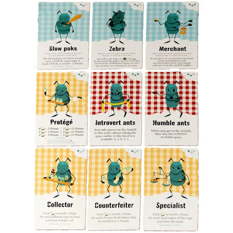 Gameplay: Move ants along a trail, collect food tokens, and influence their value based on how ants progress to the anthill.