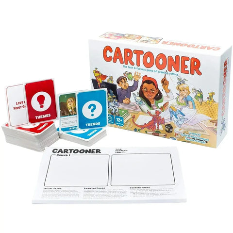 Cartooner is a new experience in drawing games, a game that combines storytelling and drawing. It's like Once Upon a Time, plus Pictionary, with story prompts inspired by popular and quirky comic themes and trends. While this is a game about drawing, it's not a game in which the best artist wins, as your strategy and ability to adapt quickly matters much more. Points are awarded for strategy and following the rules, not artistic ability. However, if you are an artist, it is undeniable that Cartooner can be a great companion for you as well. A solo mode has been designed just for that.