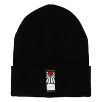 Showcase your love for Demon Slayer with the Hanafuda Earring Cuff Beanie Hat by Bioworld. Inspired by Tanjiro Kamado's iconic Hanafuda earrings, this black beanie displays an embroidered red sun against a black and white landscape, capturing the unique design fans recognize and love. Made for Demon Slayer enthusiasts, it’s both a stylish and functional addition to any winter wardrobe.