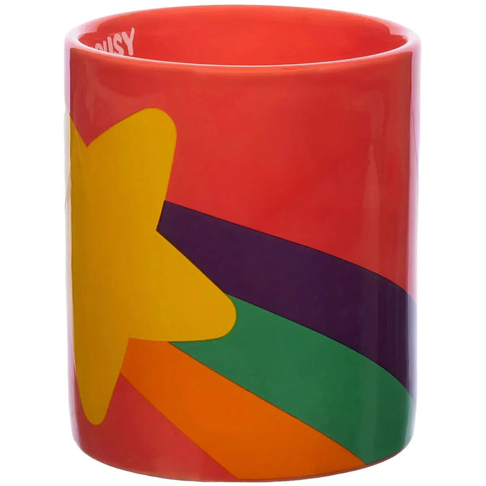 Stay warm in Gravity Falls with a hot cup of chocolate. This pink mug features a rainbow star design just like Mabel's sweater. "I am all curiousy inside" is printed on the inside.