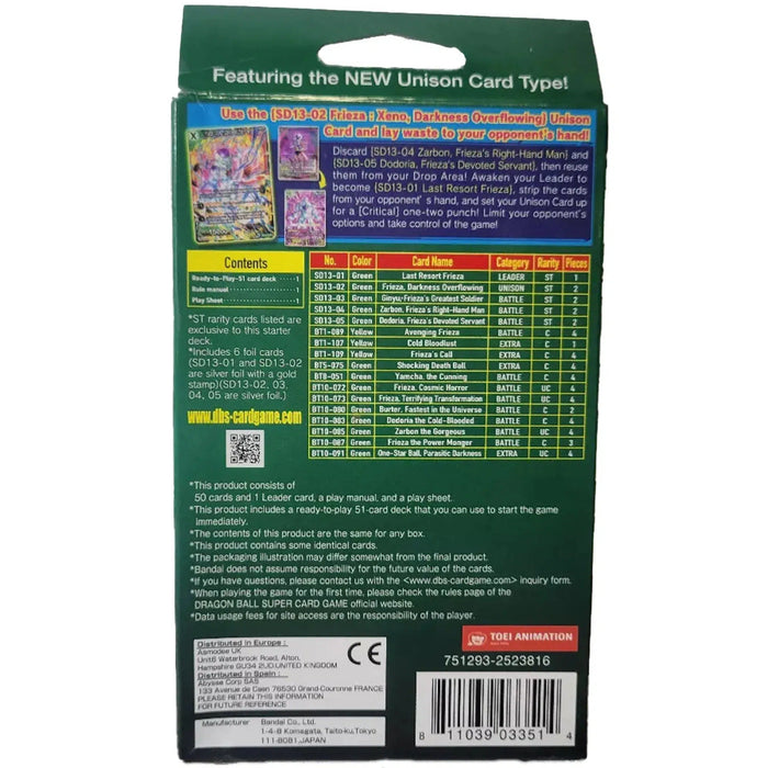 Comprehensive Preconstructed Deck: Experience the thrill of battle with a meticulously crafted 51-card preconstructed deck, strategically deck, strategically designed to unleash the might of the frieza starter deck clan collusion. embrace the power of 5 exclusive card, including an exclusive unison card, amplifying your arsenal with unique abilities.