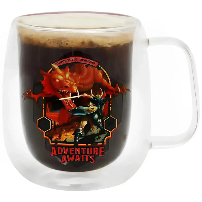 Begin your day with a touch of fantasy and nostalgia as you sip from the “Adventure Awaits” glass mug inspired by classic Dungeons & Dragons poster art. Whether you're prepping for a campaign or simply reflecting on epic quests of the past, this collectible mug brings imagination to your tabletop. The design stirs the spirit of exploration and storytelling from the first glance.