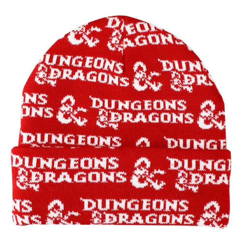 Embrace the magic of Dungeons & Dragons with this stylish cuff beanie, perfect for dedicated fans of the iconic role-playing game. In a striking red color, this beanie showcases the game's title and logo in white across a bold jacquard pattern. A woven label with the title on the back adds extra detail, making this beanie a standout accessory that lets you express your D&D pride wherever you go.