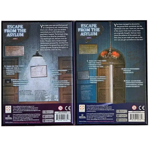 Escape from the Asylum: Parts 1 & 2 (Limited Edition) is an intense escape room experience in the form of a cooperative board game, now enhanced with premium deluxe components. Set within the unsettling North Oaks Asylum, players take on the roles of different characters, each desperately trying to escape its mysterious depths.