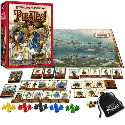 Set sail for a thrilling journey across the Caribbean seas in Extraordinary Adventures: Pirates!—a fast-paced board game where cunning, strategy, and treasure rule the waters. Assemble your pirate crew, command your ships, and race against rival captains in a swashbuckling quest for glory and gold!