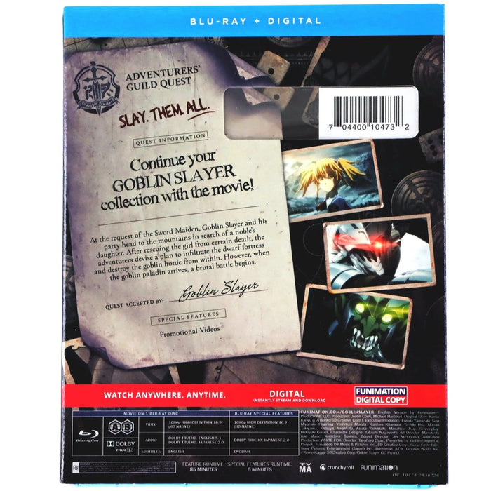 Embark on a gripping adventure with Goblin Slayer: Goblin's Crown on Blu-ray. Join Goblin Slayer and his party as they heed the call of the Sword Maiden, venturing into the treacherous mountains to rescue a noble's daughter. Their mission takes a perilous turn as they confront a formidable goblin horde lurking within a dwarf fortress.