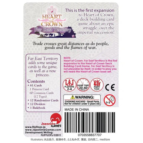 Heart of Crown: Far East Territory - Expansion Pack adds new layers of strategy and excitement to the popular deck-building game, Heart of Crown. Designed for 2-4 players and typically played in about 60 minutes, this expansion brings the dynamic world of imperial succession into the Far East.