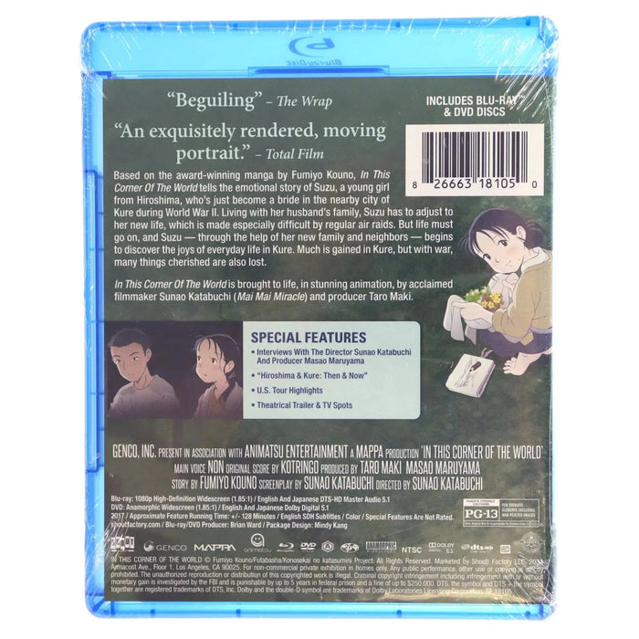 In This Corner of the World received widespread critical acclaim for its storytelling, animation, and emotional depth. It won numerous awards, including the Hiroshima Peace Film Award and multiple accolades at Japanese film festivals. The film was praised for its realistic depiction of wartime life, especially its focus on the impact of the atomic bomb and the resilience of the survivors. The movie also earned a nomination for Best Animated Feature at the 21st Online Film Critics Society Awards, though it ultimately lost to Coco.