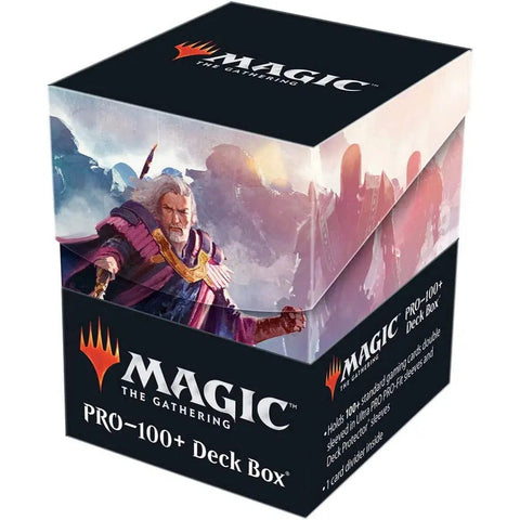 The 100+ Deck Box card storage container features vibrant, full-color artwork from Magic: The Gathering and includes a deck divider. Made with archival-safe, non-PVC, rigid polypropylene materials, you can store up to 100 double-sleeved cards with confidence. The self-locking lid keeps your cards securely stored when not in use, while also offering easy access. Sized for standard-size trading cards.
