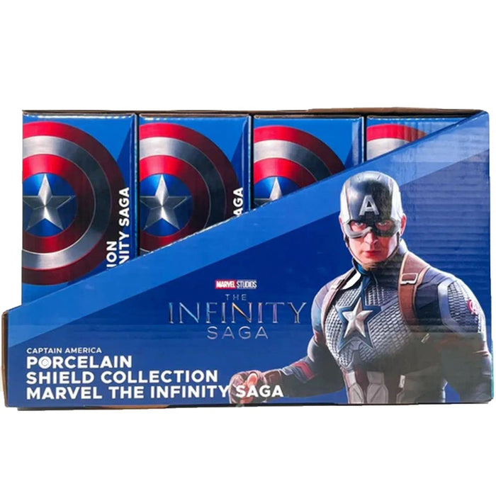 dCelebrate Captain America's legacy with this exclusive collection of porcelain shield figures from Marvel's Infinity Saga. Each shield, measuring approximately 4 inches in diameter, represents a significant piece of Captain America's iconic weaponry. From its unpainted beginnings to its battle-worn finish, these shields highlight different stages of its storied history. Perfect for collectors, this blind bag set offers a thrilling surprise with each unboxing.