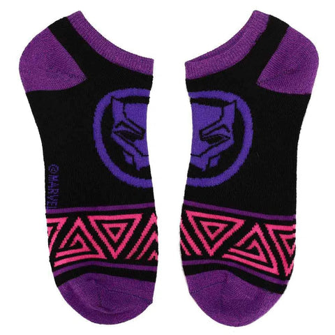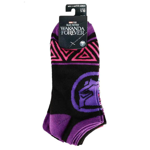 Celebrate the legacy of Wakanda with the Marvel: Black Panther - Wakanda Forever Ankle Socks by Bioworld. This set of five unique pairs features striking custom designs, including the iconic "Wakanda Forever" text, making it a stylish tribute to Marvel’s legendary hero. Perfect for adding a bold statement to your everyday attire, these socks are a must-have for fans of Black Panther.