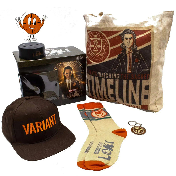 This exclusive box set includes a variety of TVA-themed items to enhance your Marvel collection. It features a stylish hat, a versatile tote bag, and cozy crew socks, all adorned with distinctive TVA designs. Complete the set with a keychain and an LED light, each designed to bring a touch of the TVA's unique charm into your daily life.