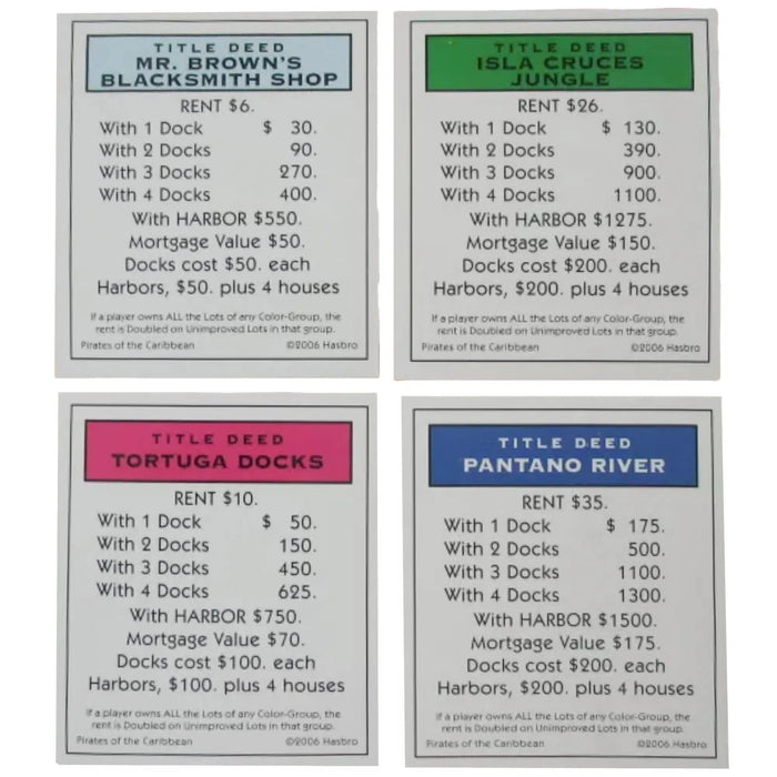 Customizations include: the properties being changed to places in the series, Chance and Community Chest cards have been changed to "Pirate's Dice" and "Aztec Gold", Railway stations are now "ships" and the pewter tokens have been changed to objects like a "pirate hat" to match with the theme.