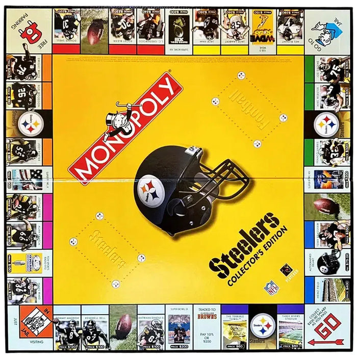 Game for the Die-Hard Fan: Bring home the thrill with Monopoly - Pittsburgh Steelers Collector's Edition. Perfect for avid Steelers enthusiasts, this game adds a unique twist to your collection. Engage with 2 to 6 players and navigate the board to buy, sell, and trade iconic players from the stellar Steelers offense, featuring legends like Ben Roethlisberger, Hines Ward, and Troy Polamalu.