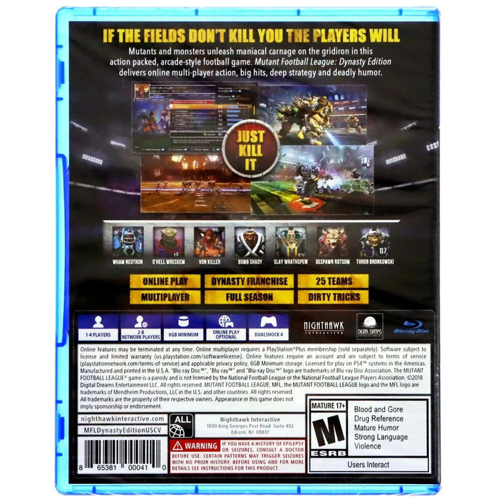 In "Mutant Football League (Dynasty Edition) for PlayStation 4," experience an action-packed, arcade-style football game filled with intense online multiplayer action, deep strategy, and deadly humor. This edition includes all DLC and introduces new features like a single-player experience where you become the coach and GM of your favorite Mutant Football League franchise. Manage multiple seasons, trades, player XP, salary, custom playbooks, and free agent signings to build your Dynasty.