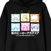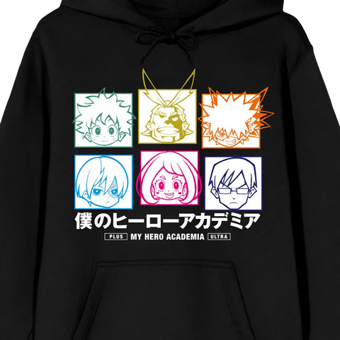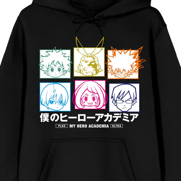 Embrace your inner hero with this My Hero Academia Chibi Characters Men's Hoodie by Bioworld. Featuring vibrant drawings of fan-favorite characters like Deku, All Might, Bakugo, Ochaco, and Todoroki in playful chibi form, each hero is showcased in colorful squares across the front of the sweatshirt. White kanji letters add an authentic anime touch, making this hoodie a must-have for any My Hero Academia fan.
