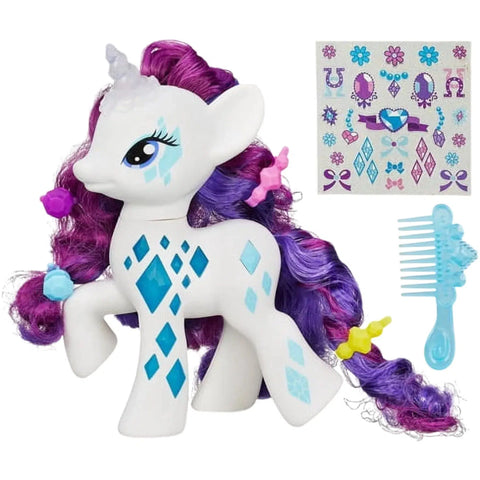 The My Little Pony: Friendship is Magic - Glamour Glow Rarity Toy Figure by Hasbro brings the elegance and charm of Rarity to life in a dazzling new way. This electronic figure features Rarity's signature Cutie Marks and lights up with a magical glow, making her sparkle like diamonds. Rarity's horn can be decorated with a special accessory, while her gorgeous hair and tail can be styled using the included comb and four colorful barrettes, allowing for endless creative play.