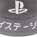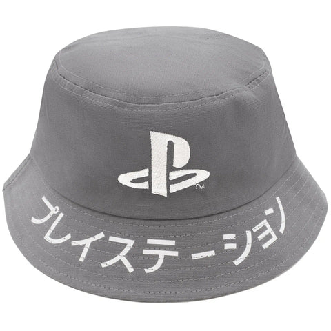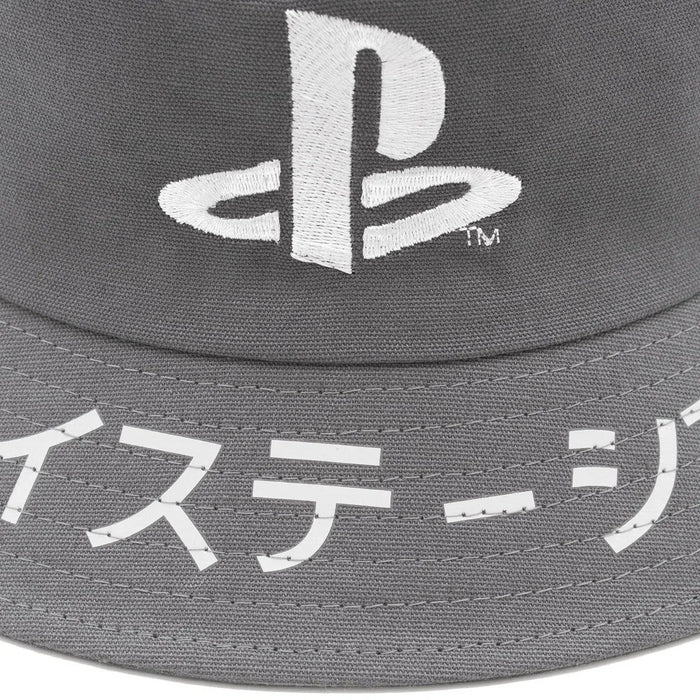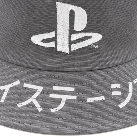 Design 2: The gray bucket hat showcases a larger PlayStation logo with Japanese writing underneath, translating to "PlayStation."