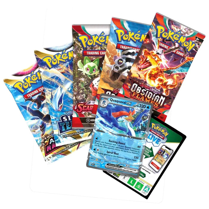 Inside the tin, you'll get a foil promo card of Quaquaval ex, perfect for strengthening your deck with powerful moves. Additionally, you'll find five Pokémon TCG booster packs, each containing 10 cards, along with a Basic Energy or VSTAR marker. These booster packs offer a chance to discover new Pokémon, improve your deck, and add valuable strategies to your game.
