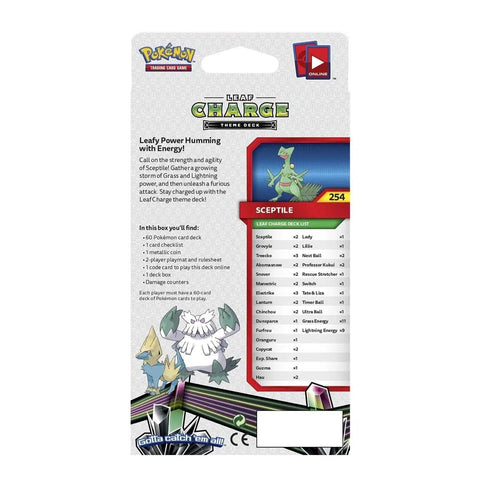 Within the deck's box, uncover a comprehensive set of components essential for thrilling battles. The 60 Pokémon cards, meticulously selected from the grass and lightning types, form the foundation for engaging gameplay. The back of the box provides a detailed card list, ensuring strategic planning before each challenge. Additionally, discover a card checklist, metallic coin, 2-player playmat with a rulesheet, a code card for online play, a deck box, and damage counters—a complete package for an immersive and competitive Pokémon TCG experience. Harness the power of Sceptile and ignite a storm of Grass and Lightning with the Pokémon TCG: Sun & Moon—Celestial Storm Leaf Charge Theme Deck.