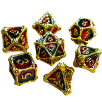 The metallic edges are bold and striking, shaped like relics from an ancient world where dragons ruled. What makes these dice stand apart is their intricate artistry—each face adorned with a fine-scaled texture that gives off the illusion of a relic forged in dragon fire. The shimmering red and gold enamel glows with an otherworldly energy, giving players a sense of wielding something both powerful and arcane.