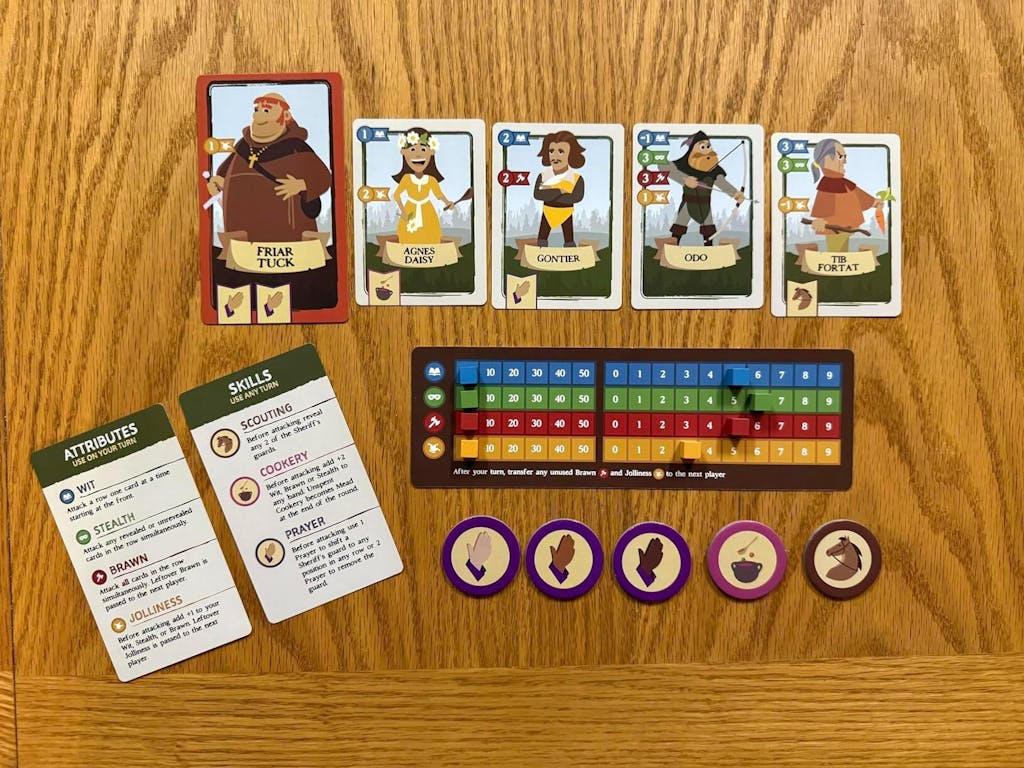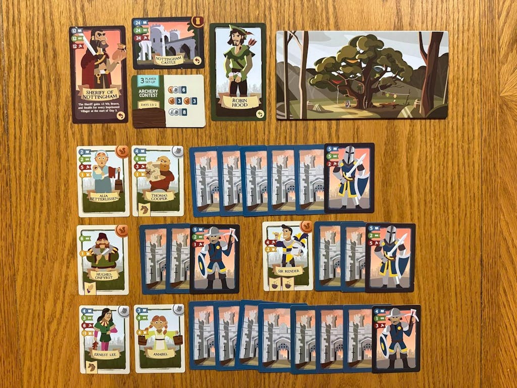 The game is set in Sherwood Forest and the town of Nottingham, populated by eclectic villagers, the dastardly Guards of the Sheriff of Nottingham, and Robin Hood and his Merry Band Leaders. Rescuing Robin Hood is made up of 5 game rounds, representing the 5 days you and your fellow players have to rescue Robin Hood before he is executed. Each turn you will draw 4 cards from your deck, total up the Skills and Attributes from those cards and attempt to rescue Villagers in the first 4 rounds and Robin Hood in the final round. Rescuing Robin Hood is a collaborative game so you will either win or lose together with your fellow players depending on whether you successfully rescue Robin Hood.