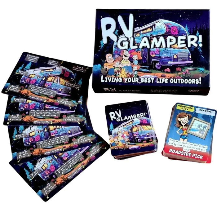 Step into a world of colorful campsites, quirky decor, and competitive fun in RV Glamper! — the ultimate family card game with a pirate twist. Each player builds their dream RV site, filling it with charming touches and stylish flair, all while outsmarting the competition.