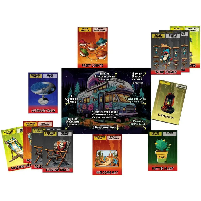 Creative tableau-building gameplay with unique collectibles: Players compete by decorating RV sites using themed cards featuring décor like tables, plants, lights, and quirky items.