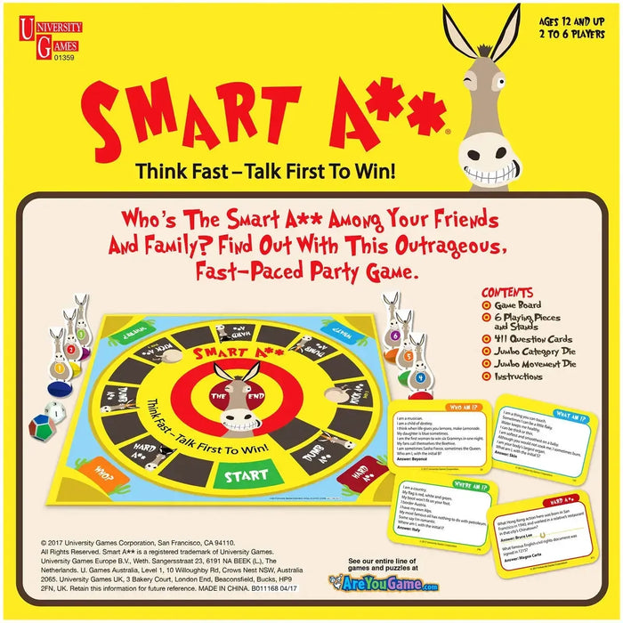 Ideal for 2 to 6 players aged 12 and up, Smart A** invites you to bring your smartest (and funniest) self to the table. Prepare to yell, laugh, and outsmart your opponents in this unforgettable, fast-moving challenge.