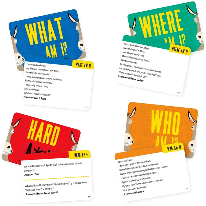 Get ready to test your wits and quick reflexes in Smart A**, the hilarious and fast-paced trivia game that keeps everyone on their toes. With no turns to wait for, players must shout out answers as soon as they recognize the clues. This keeps the energy high and the competition fierce, making every moment a chance to prove your trivia prowess or quick-thinking skills. Timing is everything—jump in too soon and you risk losing your chance; hesitate too long and someone else might steal the win.