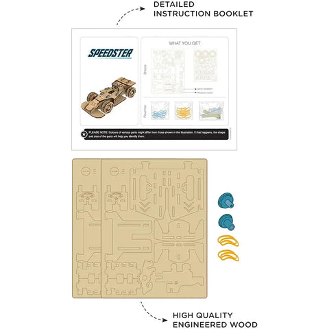 • Includes engineered wooden sheet, bands, assembly hook, detailed instructions and all other parts to make this cool Speedster race car.