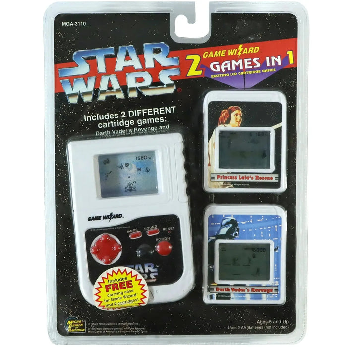 Step back into the golden era of portable gaming with the Star Wars Game Wizard Electronic LCD Handheld Console (1995) by Micro Games of America. This retro collectible features the innovative “2 Games in 1” cartridge system, delivering twice the galactic action with Darth Vader’s Revenge and Princess Leia’s Rescue. Designed during the height of 90s handheld gaming, the Game Wizard combines classic LCD gameplay with interchangeable cartridges, allowing fans to expand their collection and trade games with friends.