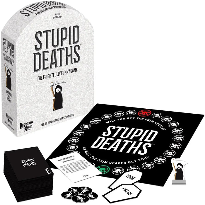 Stupid Deaths is the Frightfully Funny Game where you might die laughing! It turns out Charles Darwin was right about only the fittest surviving. Many people die in utterly ridiculous ways, and this game celebrates the stupidest deaths over the centuries while challenging players to identify myth versus fact. In this hilarious party game, players work to beat the Grim Reaper before the Grim Reaper beats them. Stupid Deaths is the game of dark fun, where players who are dead right win!