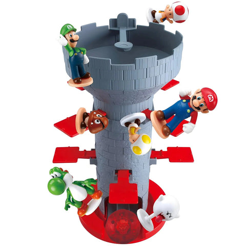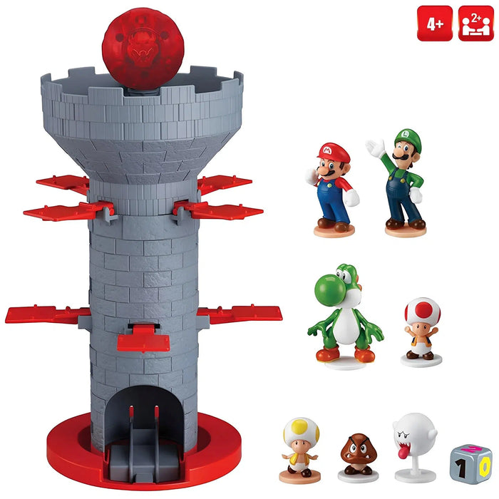 The game includes an easy-to-assemble tower and seven unique Super Mario action figures, along with a die. Gameplay begins as players roll the die to determine how many characters to place on or remove from the tower. The goal is to maintain the tower's balance while carefully adding or removing figures—one wrong move and Mario and his friends might tumble!