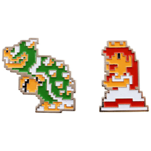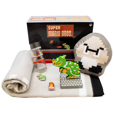 Contents: Throw Blanket, Retro Bowser Vinyl Figure, Goomba Plush Pillow, Pint Glass, Bowser Enamel Pin, Princess Peach Enamel Pin